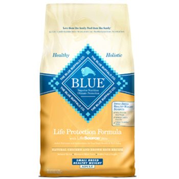 Blue Buffalo Small Breed Healthy Weight Adult Dog Food -- Natural Dog Food Small breed dogs are universally loved for their boundless energy and expressive personalities. Blue Buffalo Chicken and Brown Rice formula for small breed dogs is created with ingredients chosen specifically to help address the special needs of your small breed dog. Each piece of small-bite kibble is packed with high quality deboned chicken, providing essential amino acids and the taste dogs love; complex carbohydrates in whole-grain form provide the sustainable energy small breed dogs need; healthy garden veggies like whole carrots and sweet potatoes supply nutrients, and naturally nutritious fruit like blueberries and cranberries offer antioxidants and phytonutrients for long-term health. Natural, delicious and highly digestible, Blue Buffalo Adult Small Breed Life Protection formula is gluten-free and contains no animal by-products or artificial preservatives. Your dog will thrive on it. LifeSource Bits are a unique feature of Blue Buffalo Adult Small Breed Life Protection Formula Dog Food with a precise blend of nutrients and antioxidants selected to help maintain the health of your dog's immune system and provide support for specific life stage requirements. LifeSource Bits are cold-formed to help maintain the full nutritional potency of their ingredients. Other brands process their foods with heat up to 350°, which means their added vitamins, antioxidants and nutrients can lose up to 75% of their potency. This extra measure of protection is found in no other dog food.